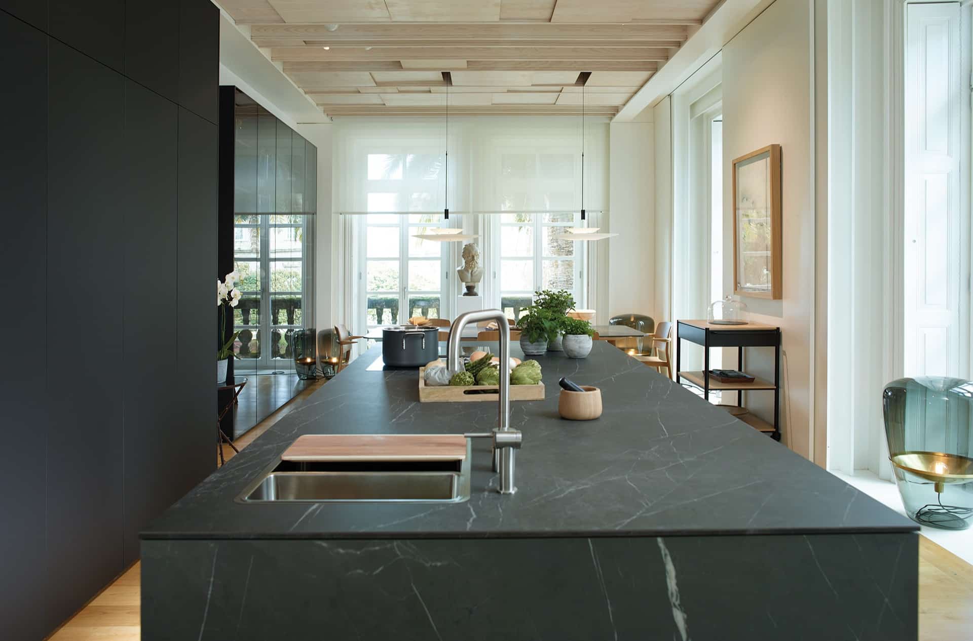 - Bancadas de pedra natural e compostos tecnológicos.